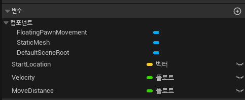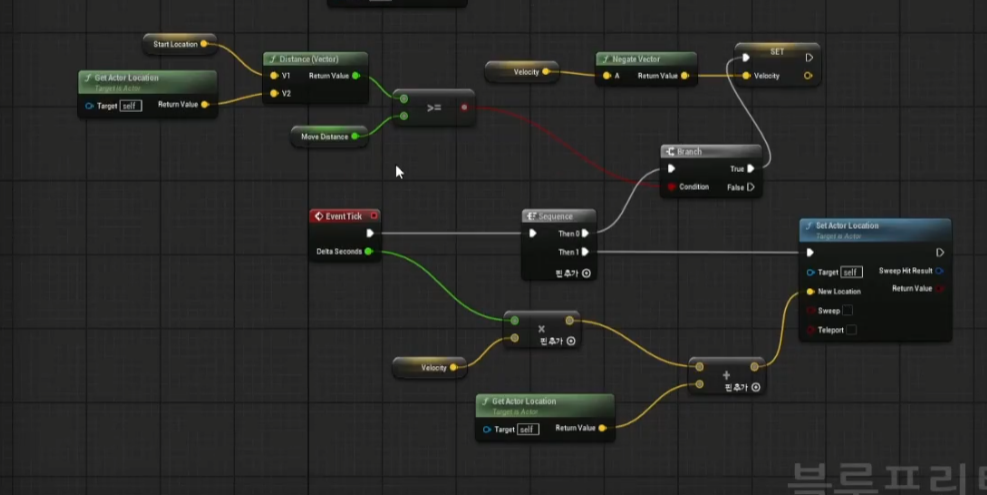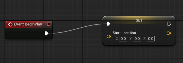 이와 같이 연결되어 있으면 Velocity의 값인 (1, 0, 0)을 Start Location 에 저장한다는 의미이다.