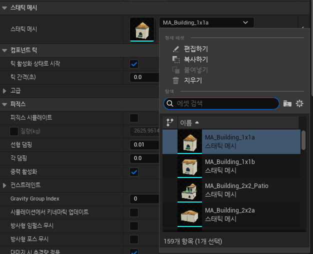 아래 이미지와 같이 우측 디테일 화면창에서 스태틱 메시를 찾아 원하는 이미지를 선택한다.