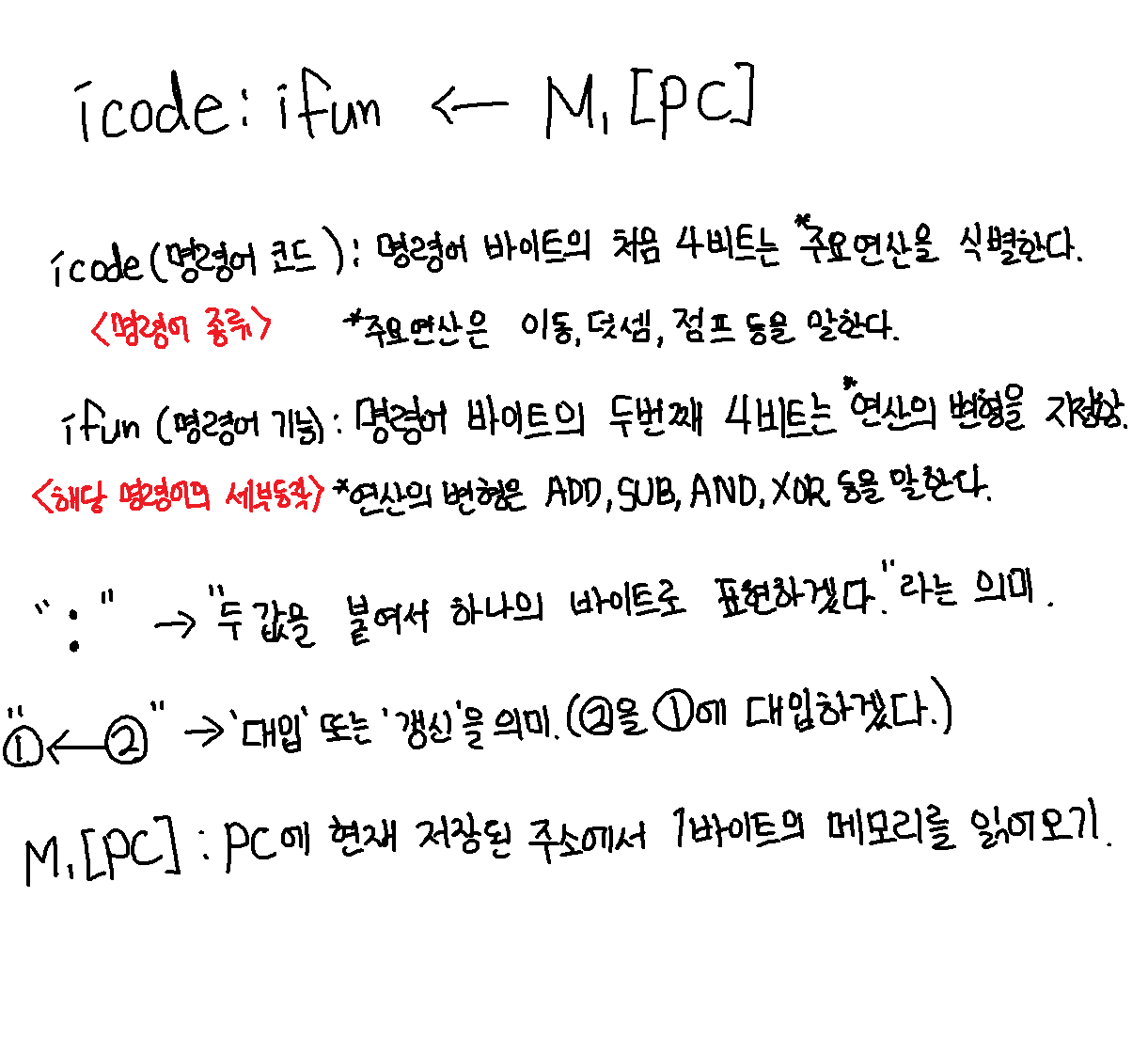 - Opcode(연산 코드) : 명령어가 수행해야 할 작업을 지정한다. ex) ADD(덧셈), LOAD(데이터 읽기), JUMP(분기) 등