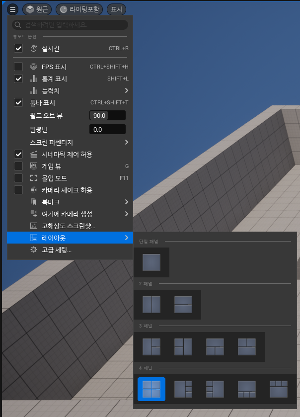 뷰 포트 내부에 있는 메뉴 클릭 > 레이아웃 클릭 > 4채널 클릭