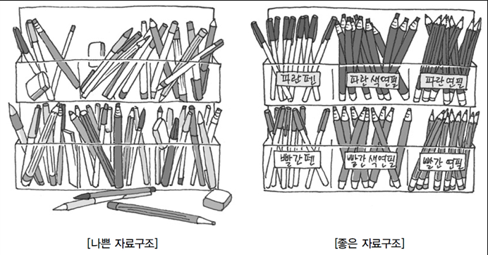예를 들어, 문구점에서 필기구를 진열하는 방법을 떠올려보자.